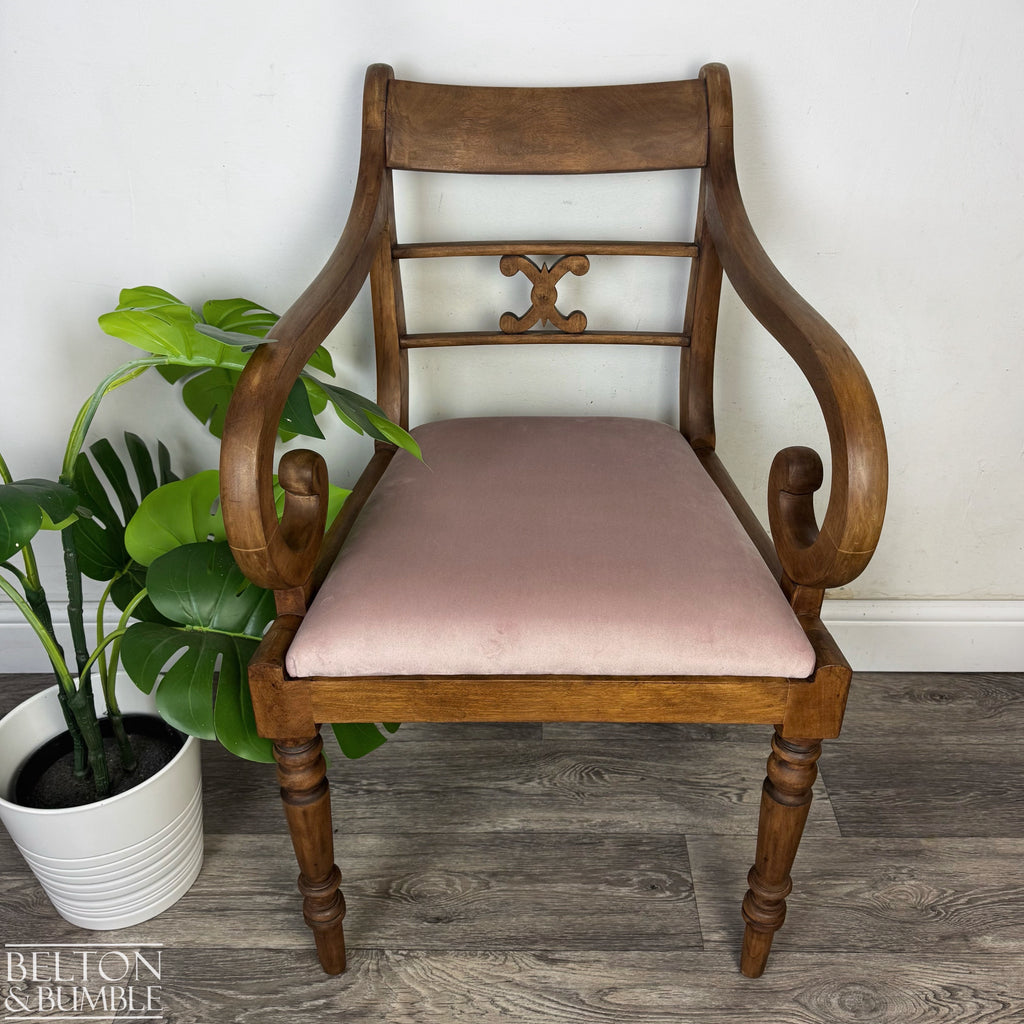 The graceful scroll arms flow into a gently curved back, where a delicate carved motif sits as a subtle decorative flourish. Its newly upholstered seat, covered in a soft blush velvet, adds a modern softness that pairs perfectly with the richness of the waxed wood.