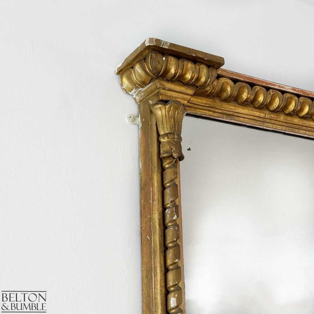 The original gilded finish has age-related wear with areas of loss, adding character and texture to the piece. The mirror plate shows minor patina, typical of age, while still offering a clear reflection.