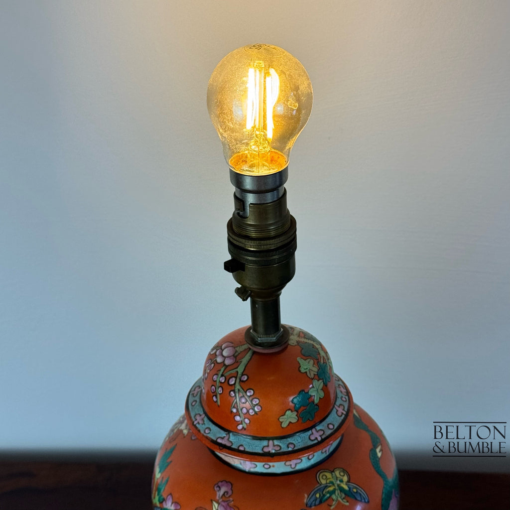 A striking vintage table lamp fashioned from a ginger jar base with a vibrant orange ground, richly decorated with hand-painted birds, butterflies, and floral motifs. The bold palette of greens, pinks, and yellows stands out beautifully against the vivid background, making this a statement piece for any interior.