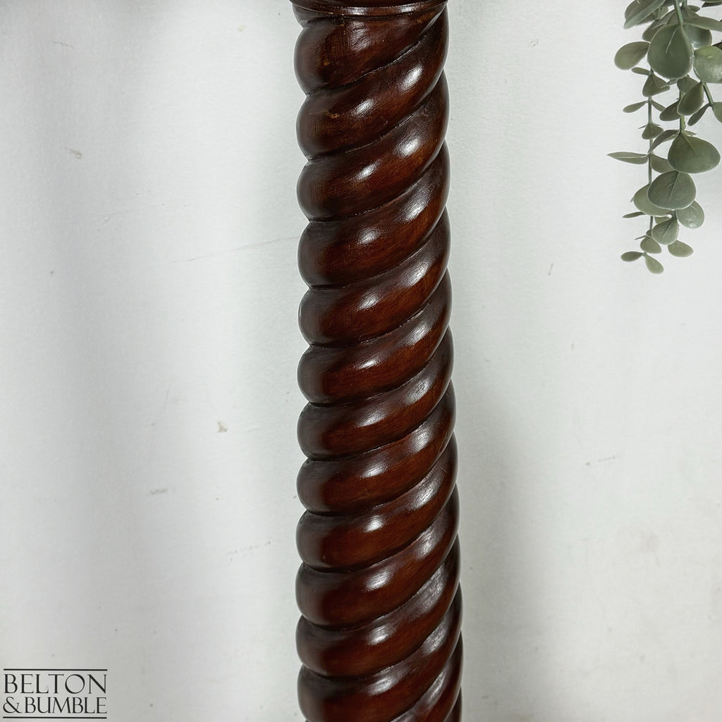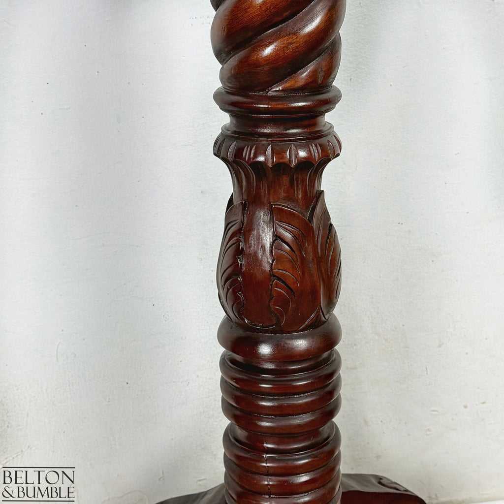 A beautifully crafted mahogany torchere featuring a circular turned top above a thick spiral barley twist pedestal, raised on a sturdy tripod base terminating in intricately carved ball and claw feet. Decorative leaf carving throughout adds elegance and character, making this a striking traditional piece.